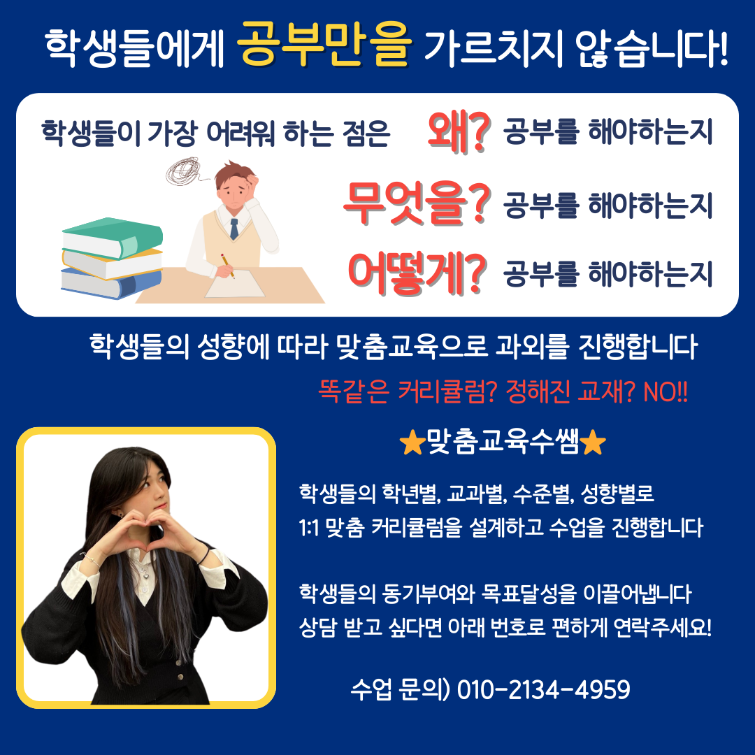 | 고운동 고등영어 국어과외 중학수학 초등학생 한국사 검정고시 과탐 사탐 필수과목 (0) | 2024.04.05 |
